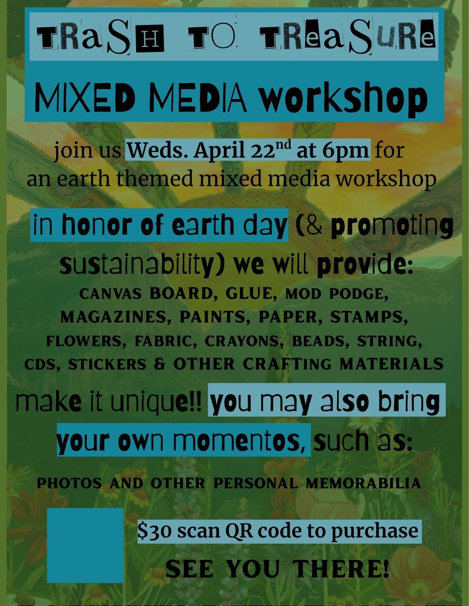 Join us this EARTH day April 22nd at 6pm for our first mixed media workshop! You are free to bring anything personal you would like to add to your artwork, but we will be providing so many fun craft materials and good vibes. Come have drinks and eat with your friends while making cool fun art!